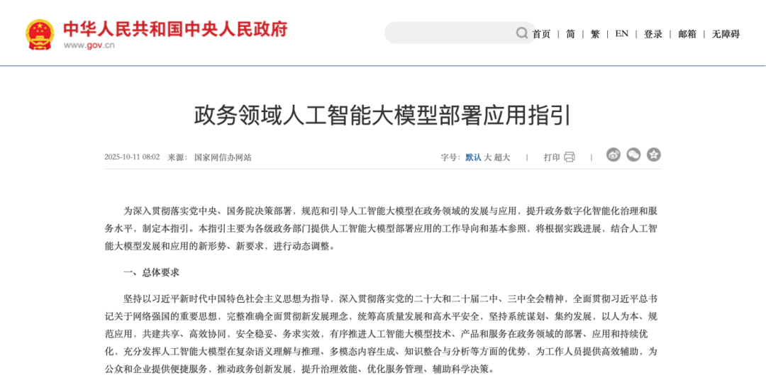 中央网信办、国家发展改革委近日联合印发《政务领域人工智能大模型部署应用指引》(以下简称《指引》),为各级政务部门提供人工智能大模型部署应用的工作导向和基本参照。