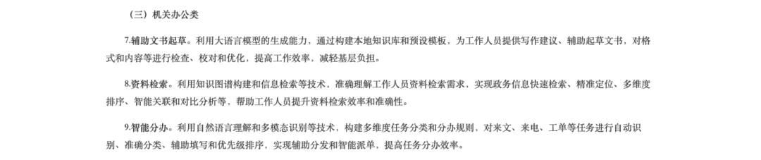 《指引》强调场景牵引,围绕政务服务、社会治理、机关办公和辅助决策等工作中的共性、高频需求进行明确,也指出要“因地制宜、结合实际,选择典型场景进行人工智能大模型探索应用”。