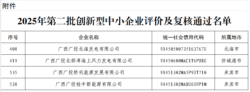 近日,自治区工业和信息化厅公布了2025年第二批创新型中小企业评价及复核通过名单,广西能源集团旗下广西北部湾海风公司、广投桂中新能源公司、广投桥巩能源公司首次入选,广投北海电厂复核通过。这是广西能源集团继入选2025年第一批创新型中小企业评价名单后,旗下企业再次获得该项认定。既是政府主管部门对企业创新发展成果的高度认可,更是广西能源集团响应广西深入实施创新驱动发展战略、科教兴桂战略、人才强桂战略,持续推动企业梯度培育、培育能源新质生产力的生动实践。