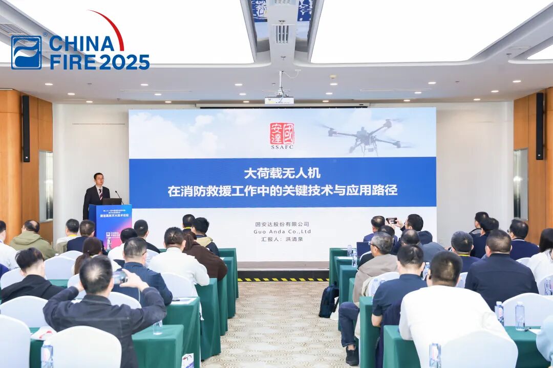 在技术交流环节,洪清泉以《大荷载无人机在消防救援工作中的关键技术与应用路径》为主题进行报告分享,展示了国安达作为承担工信部《大荷载无人机救援装备》科研项目的牵头单位,在应急救援领域领先的科研技术、创新的应用成果与较强的实战能力。