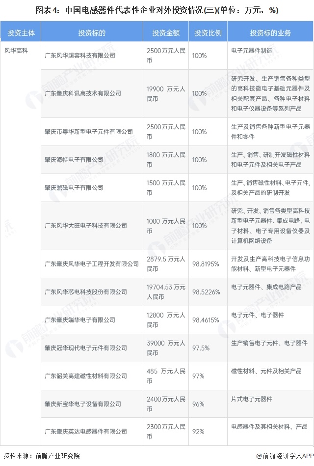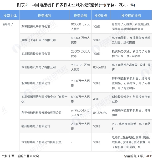 从几家代表性企业的对外投资来看,顺络电子、麦捷科技、风华高科均对电感等被动元件的上游原材料及下游电子系统有所布局,同时为了使得业务更多样化,集团设立公司生产销售其他电子元器件产品。