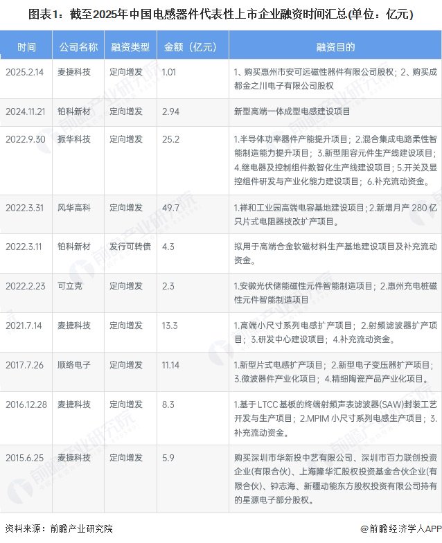 根据代表性上市企业公告的梳理,电感器件行业的上市公司融资手段主要有定向增发、可转债融资方式。从整体来看,我国电感器件上市企业的融资主要用于产能提升、生产线建设等。截至2025年主要的融资事件如下: