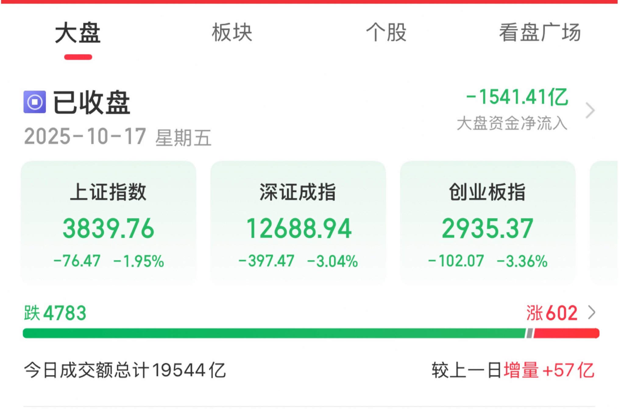 A股三大指数今日集体下跌,截至收盘,上证指数跌1.95%,深证成指跌3.04%,创业板指跌3.36%,北证50跌3.75%。沪深京三市全天成交额19544亿元,较上日放量57亿元。全市场超4700只个股下跌。