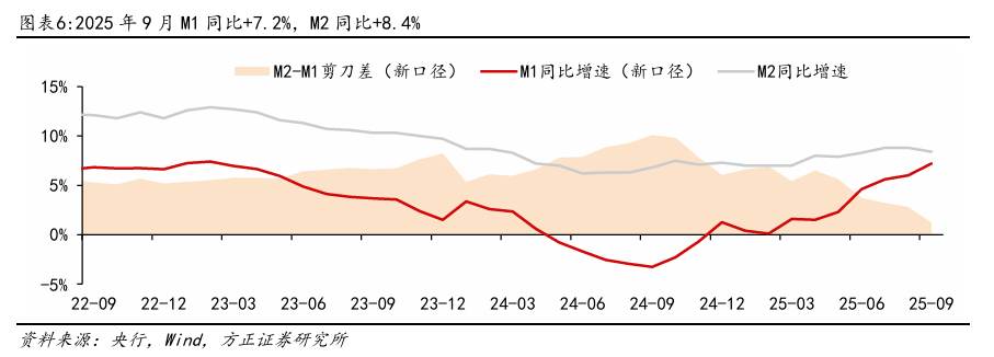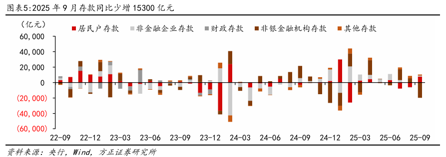 M1增速继续上行,非银存款大幅少增。9月M1同比+7.2%,增速环比+1.2pct,预计主要得益于低基数下财政支出的支撑。M2同比+8.4%,增速环比-0.4pct,M2-M1剪刀差环比收窄1.6pct至1.2%,资金活化延续。结构上看,9月存款从非银向居民端回流,9月非银存款减少1.06万亿元,同比少增1.97万亿元,而居民存款增长2.96万亿元,同比多增7600亿元,或系季末存款回流叠加去年924行情驱动非银存款高增的综合影响。