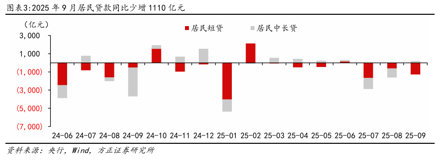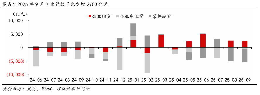 企业端:短贷-票据的跷跷板效应明显。9月企业贷款总体新增1.22万亿元,同比少增2700亿元。其中:1)企业中长贷继续小幅少增,9月新增9100亿元,同比少增500亿元,企业投资意愿平稳,9月我国制造业PMI为49.8,仍位于荣枯线以下但较8月的49.4有所改善。9月29日国家发改委表示正积极推进新型政策性金融工具相关工作,规模5000亿元全部用于补充项目资本金,预计主要投向基建、科创、消费等重点领域,有望撬动相关领域中长贷贷款需求。2)9月企业短贷新增7100亿元,同比多增2500亿元,票据压降4026亿元,同比少增4712亿元。加强实体信贷投放力度和稳息差诉求下,银行发力企业短贷的投放,压降票据规模。