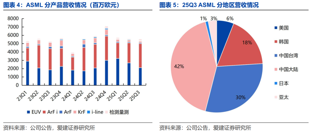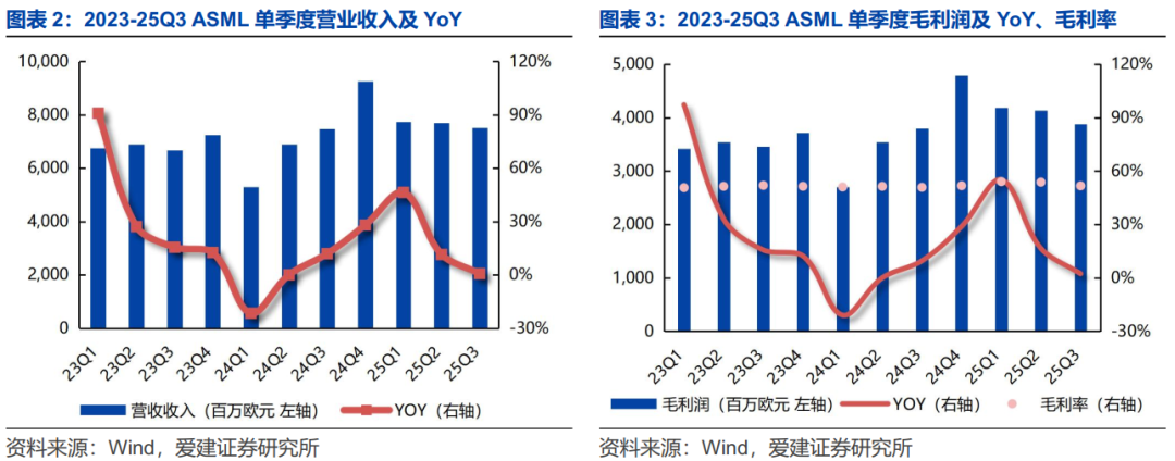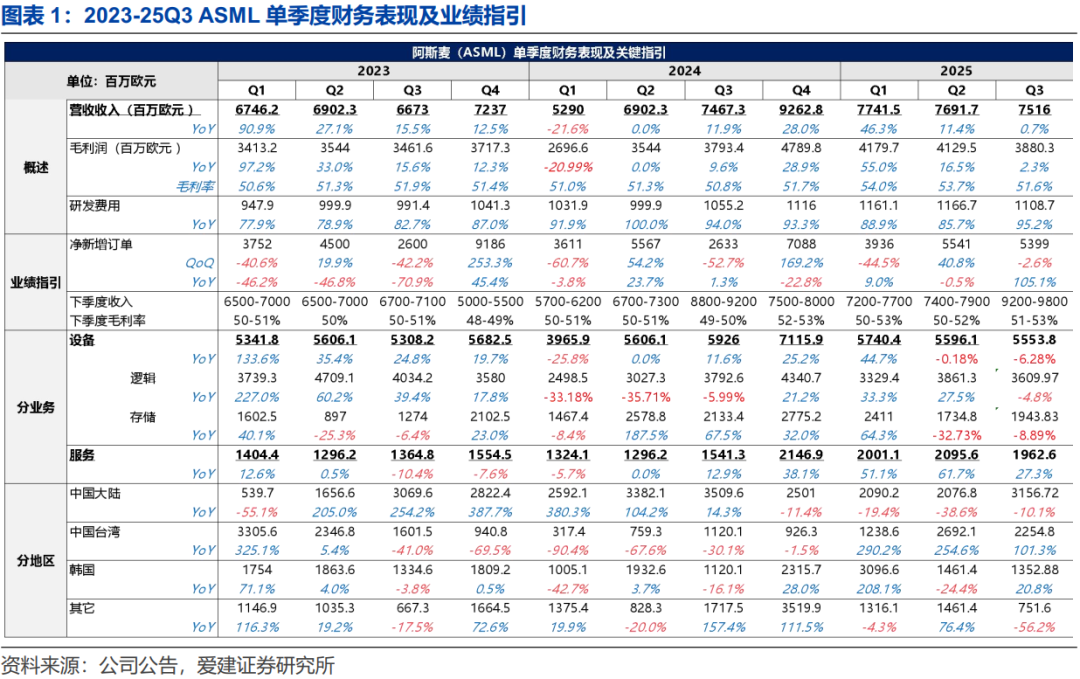 ■25Q3业绩符合预期,新增订单超预期,盈利能力稳健。ASML 公布 2025Q3 业绩:公司实现营收 75 亿欧元(QoQ -2.3%,YoY +0.7%),符合此前指引区间;毛利率为 51.6%,符合公司25Q2指引。分业务看:1)光刻设备业务25Q3收入55.54亿欧元,其中逻辑客户收入36.10亿欧元(YoY-4.8%),存储客户收入19.44亿欧元(YoY-8.9%);2)服务业务25Q3收入19.63亿欧元(YoY+27.3%)。新签订单方面,25Q3新增订单54亿欧元(高于市场预期48.9亿欧元),其中EUV订单36亿欧元,占比66.7%。25Q4及全年业绩指引:净销售额预计92–98亿欧元,毛利率区间51%–53%;研发费用约12亿欧元,销售及管理费用约3.2亿欧元。公司预计2025全年营收同比增长约15%,毛利率约52%。