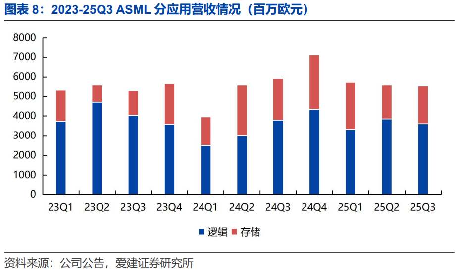 25Q3公司存储端订单增长较为明显,达到25.38亿元,我们认为存储端营收在25Q4延续强势。当前主流DRAM厂商均在加速HBM产品的迭代转型,对高层数堆叠结构的设备投资显著增加,带动EUV与ArFi设备需求上升。整体来看,我们认为存储端订单回升具有持续性,预计25Q4将维持高景气度。