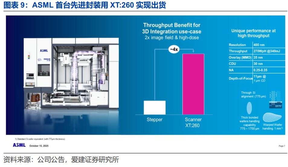 25Q3,ASML XT:260首次在先进封装领域出货。传统封装光刻机使用逐片步进曝光方式,每次曝光视场较小、曝光速度慢,因此整体生产节拍受限;XT:260 则采用扫描式光刻架构,每次曝光可覆盖更大的图像视场,并可使用更高能量剂量进行曝光,从而在保持图形精度的前提下显著提高单机吞吐量(公司披露XT:260 的产能达到 270 片晶圆/小时 @ 340mJ,约为传统封装步进机的4倍)。