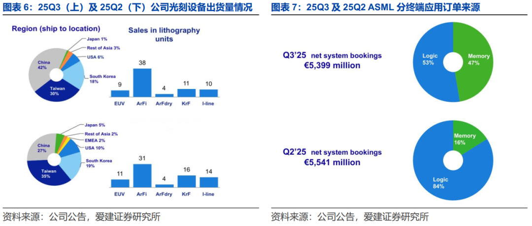 以出货量口径计,三季度EUV系统出货9台(环比-3),ArFi系统38台(环比-7),ArF Dry系统4台(持平),KrF系统11台(环比-5),I-line系统10台(环比-4)。EUV系统出货量略有下降,主要受客户产线节奏调整及部分高NA设备交付时间推迟影响。按下游应用划分,逻辑制程占比53%(环比-31pct),存储制程占比47%(环比+31pct),主要由于美光、三星产线建设加速。