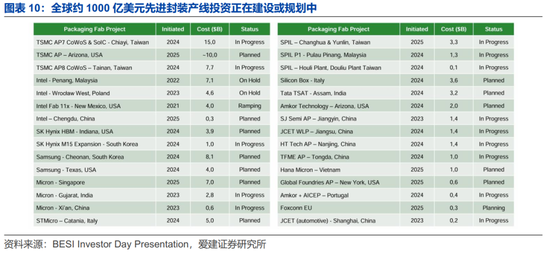 ■随着晶圆厚度和封装层数提升,芯片封装精度逼近前道工艺,后道设备“前道化”趋势明显。当AI 基础设施投资驱动终端结构向高端逻辑与DRAM转移,先进光刻机需求将持续上升。公司管理层表明客户正持续采用更多 EUV 层数(SK海力士已接收首台 EXE:5200 系统)。25Q3,ASML面向3D集成与先进封装的光刻机XT:260首次出货。随着晶圆厚度和封装层数不断增加,传统步进式光刻机在焦深控制与大视场均匀性方面已难以满足需求,XT:260具备更大的曝光视场和高能量曝光能力,在封装工艺中可实现更高Overlay精度与产能效(270片/小时@340mJ,约为传统封装步进机4倍),先进封装环节有望成为推动光刻设备架构由步进式向扫描式演进的核心驱动力。根据BESI数据,目前全球约1000亿美元的先进封装产线投资正在建设或规划中。先进封装产线参与厂商包括TSMC、Intel、SK hynix、三星、Micron、Amkor、SPIL等国际龙头,以及长电科技、通富微电、华天科技、胜宏科技等中国大陆企业,先进封装产能处于全面扩张阶段。