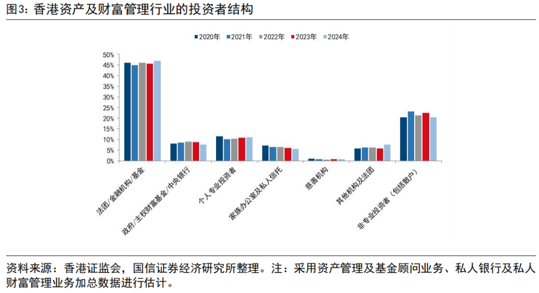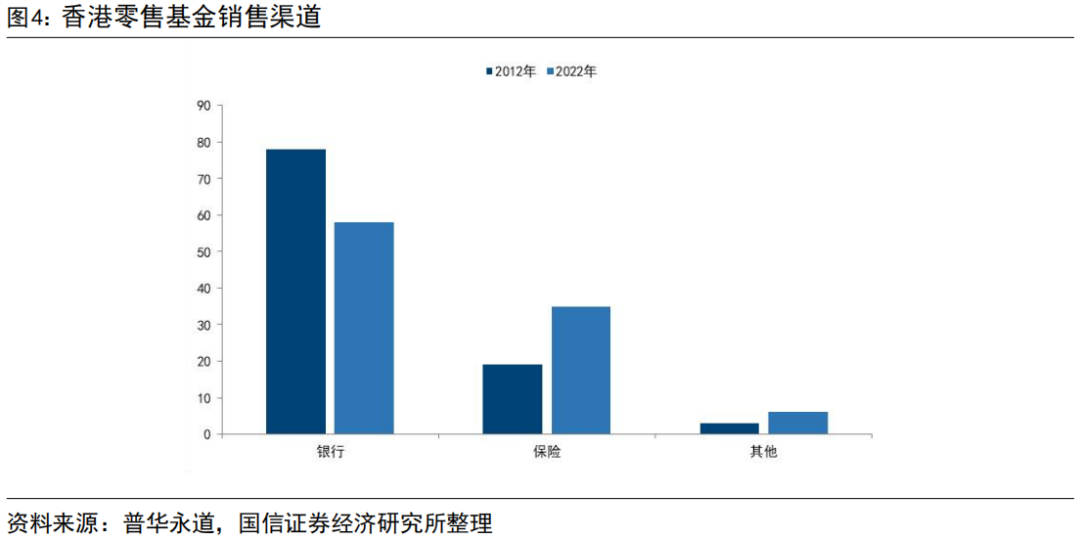 截至2024年末,香港资管行业管理资产总额达35.14万亿港元,其中41%配置于中国内地及香港,46%的资金来源亦来自于此。从地域分布看,香港本地资金占比最高,北美和中国内地分列二三位,过去五年区域结构保持稳定。投资者方面,专业机构占比达到46%,占据主导地位,个人投资者合计约31%。销售渠道长期由银行和保险公司主导,合计占据九成以上零售基金代销份额,但近十年银行渠道占比明显下滑,保险及其他新兴渠道逐步崛起。