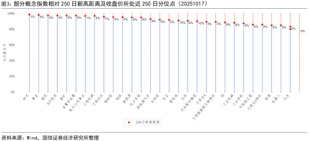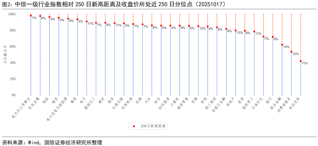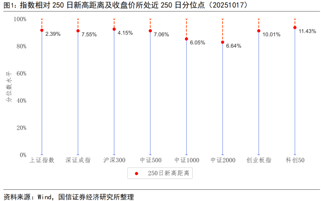 截至2025年10月17日,上证指数、深证成指、沪深300、中证500、中证1000、中证2000、创业板指、科创50指数250日新高距离分别为2.39%、7.55%、4.15%、7.06%、6.05%、6.64%、10.01%、11.43%。中信一级行业指数中电力及公用事业、有色金属、钢铁、煤炭、电力设备及新能源行业指数距离250日新高较近,食品饮料、消费者服务、综合金融、银行、石油石化行业指数距离250日新高较远。概念指数中,林木、黄金、煤炭、HJT电池、锂矿、金属非金属、电力公用事业等概念指数距离250日新高较近。