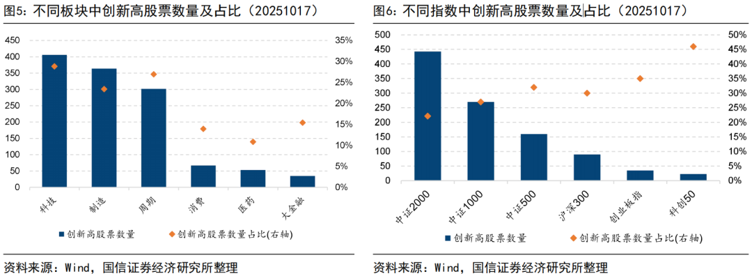 截至2025年10月17日,共1233只股票在过去20个交易日间创出250日新高。其中创新高个股数量最多的是电子、机械、基础化工行业,创新高个股数量占比最高的是有色金属、电子、钢铁行业。按照板块分布来看,本周科技、制造板块创新高股票数量最多;按照指数分布来看,中证2000、中证1000、中证500、沪深300、创业板指、科创50指数中创新高个股数量占指数成份股个数比例分别为:22.15%、27.00%、32.00%、30.00%、35.00%、46.00%。