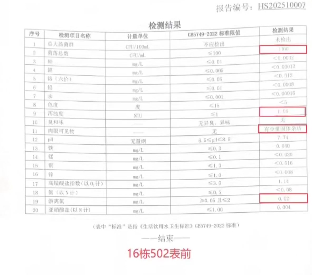 南宁市住建局公用二科科长林坚华介绍了检测结果:“市政供水和二次供水水箱出水水质合格,二次供水水箱后的小区内部供水管道及居民家中部分水质指标不合格,并已在公示栏公示。然后微生物检测是‘甲螨类’微生物。”