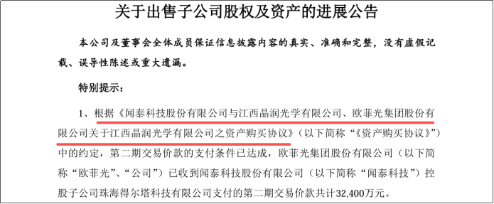 “砍单”危机之后的欧菲光,迅速调整。2021年3月,公司将得尔塔等四家子公司打包出售给闻泰科技,获得24.2亿的回笼资金。