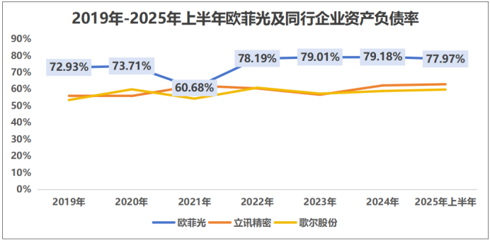 尤其是对刚从“苹果砍单危机”中缓过来的欧菲光来说,2025年上半年,公司的资产负债率达到77.97%,远超歌尔股份、立讯精密等同行企业。