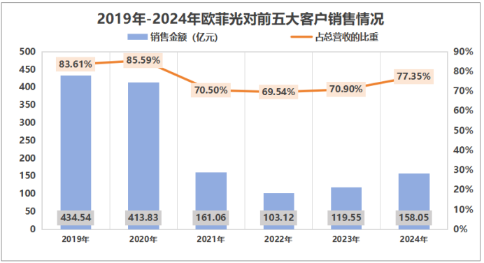 在摆脱苹果依赖后,欧菲光又陷入与华为的深度绑定。公司对前五大客户的销售收入占比从2022年的69.54%,提升到了2024年的77.35%。