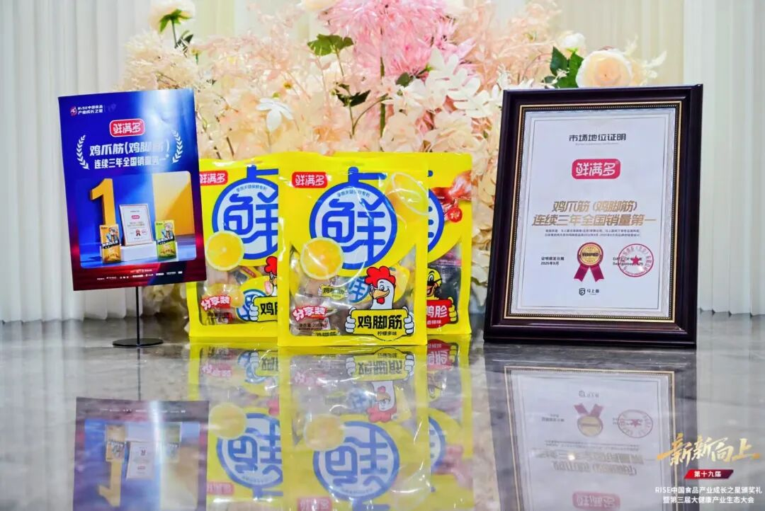 2025年10月13日,第十九届RISE中国食品产业成长之星颁奖盛典圆满举办,在活动现场,鲜满多鸡爪筋斩获马上赢权威认证 “鸡爪筋(鸡脚筋)连续三年全国销量第一”!