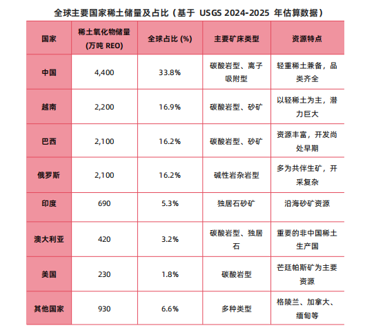 根据美国地质调查局(USGS)等权威机构的数据,全球稀土氧化物(REO)的总储量约为 1.3 亿吨。中国的储量位居世界第一,但其在全球总储量中的占比已从过去的绝对主导地位有所下降,反映出全球范围内新的稀土资源勘探有所突破。