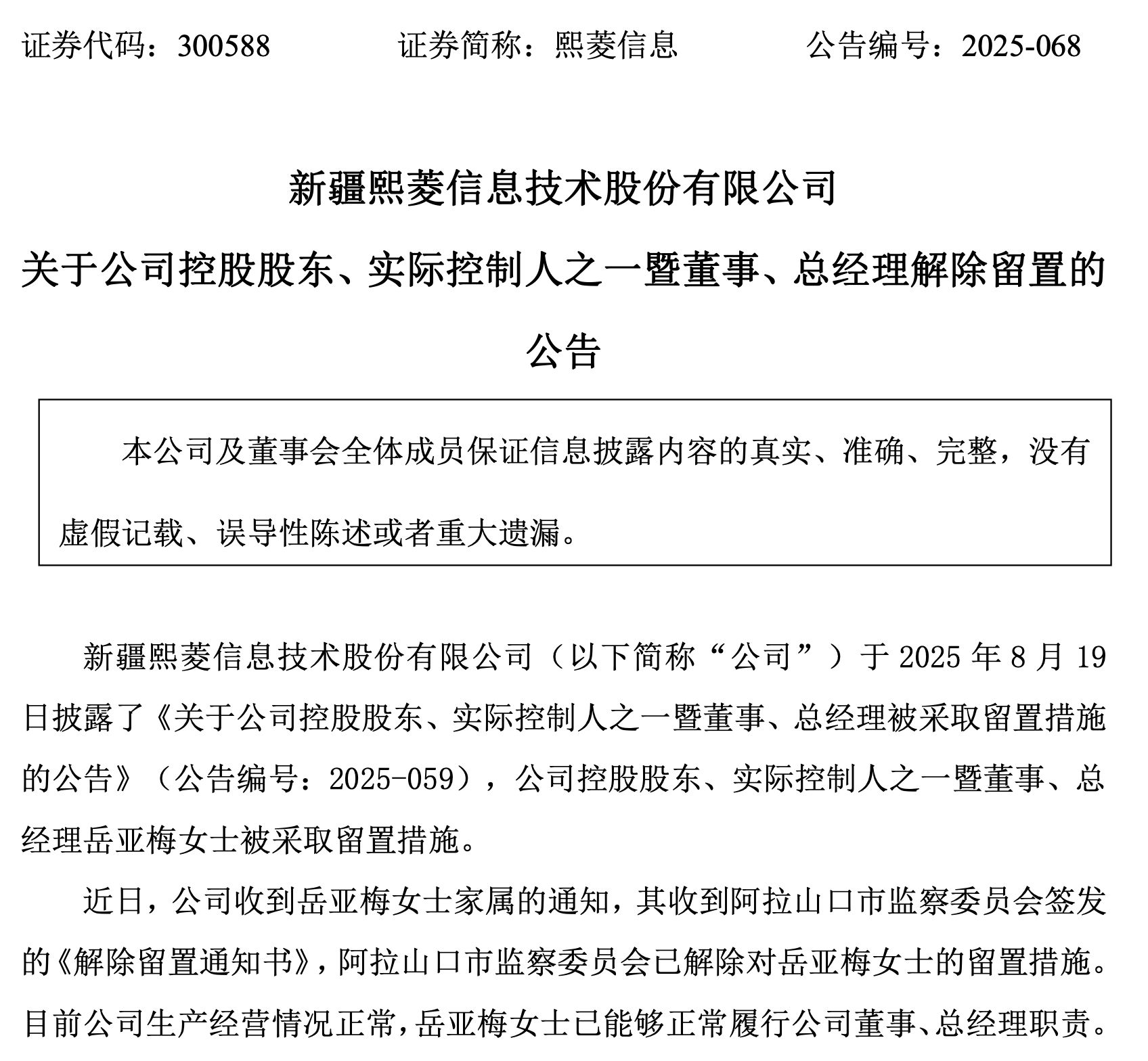 8月19日晚间,熙菱信息公告称,公司收到控股股东、实际控制人之一暨董事、总经理岳亚梅家属通知,阿拉山口市监察委员会对岳亚梅立案调查并采取留置措施。
