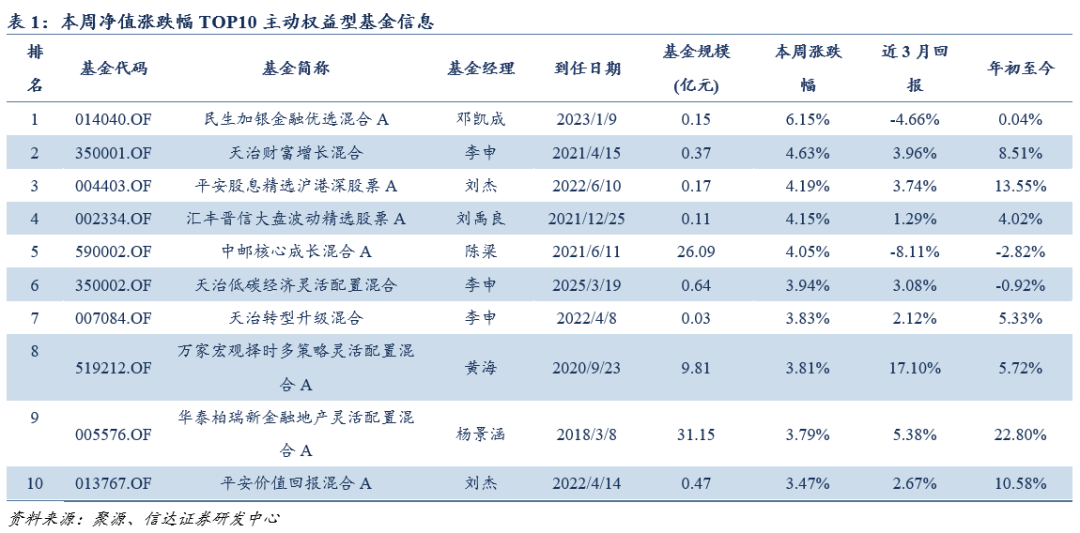 公募基金:金融、周期制造板块ETF净流入。本周主动偏股型基金的净值涨跌幅平均值-3.91%。基金总数为4522,上涨数目为264,占比达到5.84%。其中:净值表现最好的前五只基金分别是民生加银金融优选混合A、天治财富增长混合、平安股息精选沪港深股票A、汇丰晋信大盘波动精选股票A、中邮核心成长混合A,一周净值涨跌幅分别是6.15%、4.63%、4.19%、4.15%、4.05%。