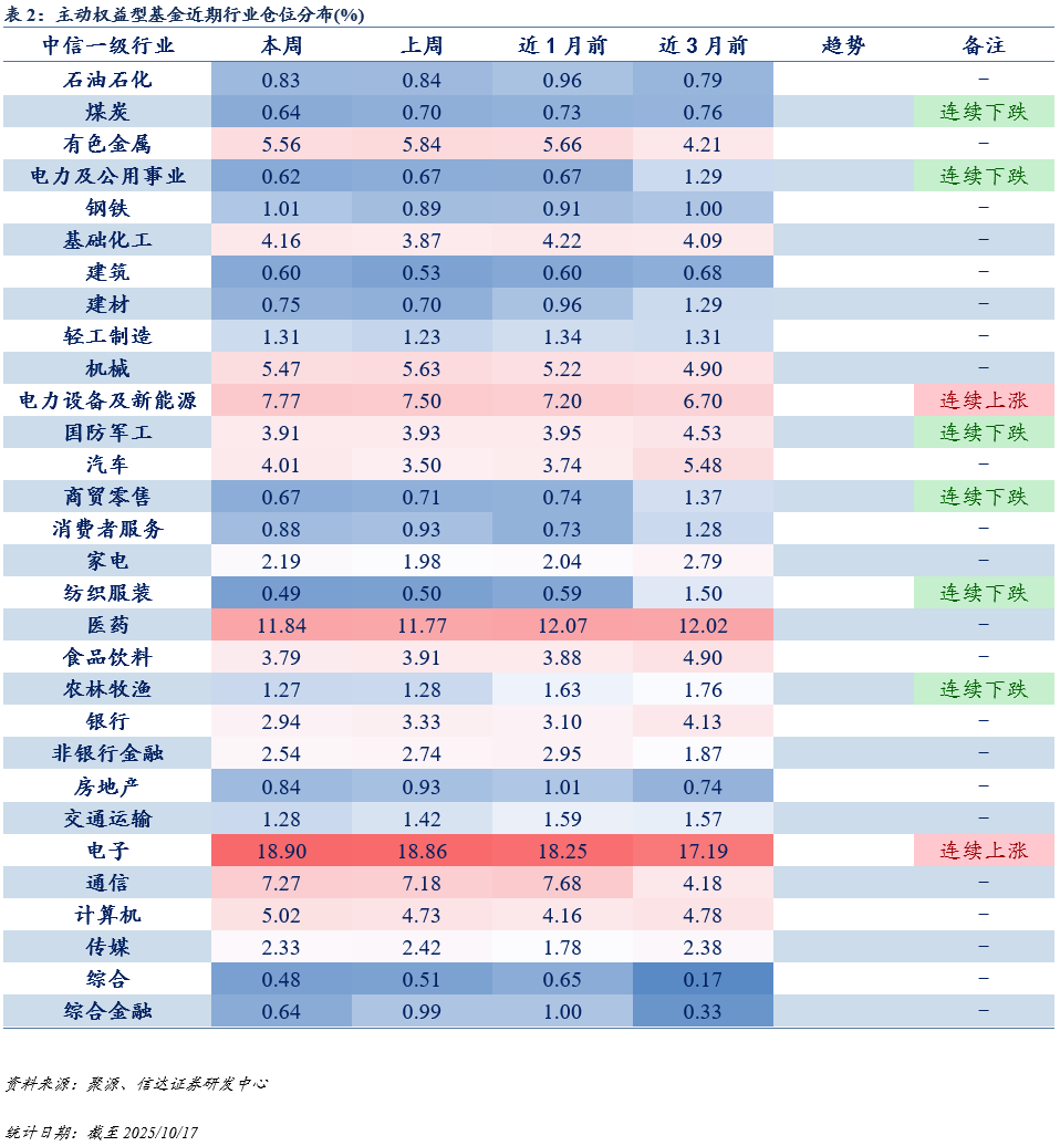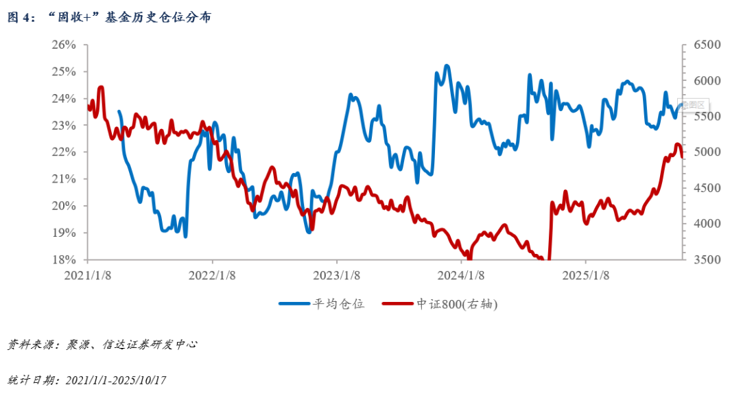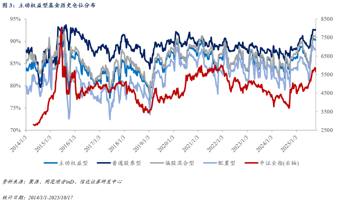 截至2025/10/17,主动权益型基金的平均仓位约为90.24%。其中,普通股票型基金的平均仓位约为92.62%(较上周上升0.07pct),偏股混合型基金的平均仓位约为90.91%(较上周下降0.24pct),配置型基金的平均仓位约为88.08%(较上周下降0.14pct);“固收+”基金平均仓位约为23.77%,较上周上升0.03pct。