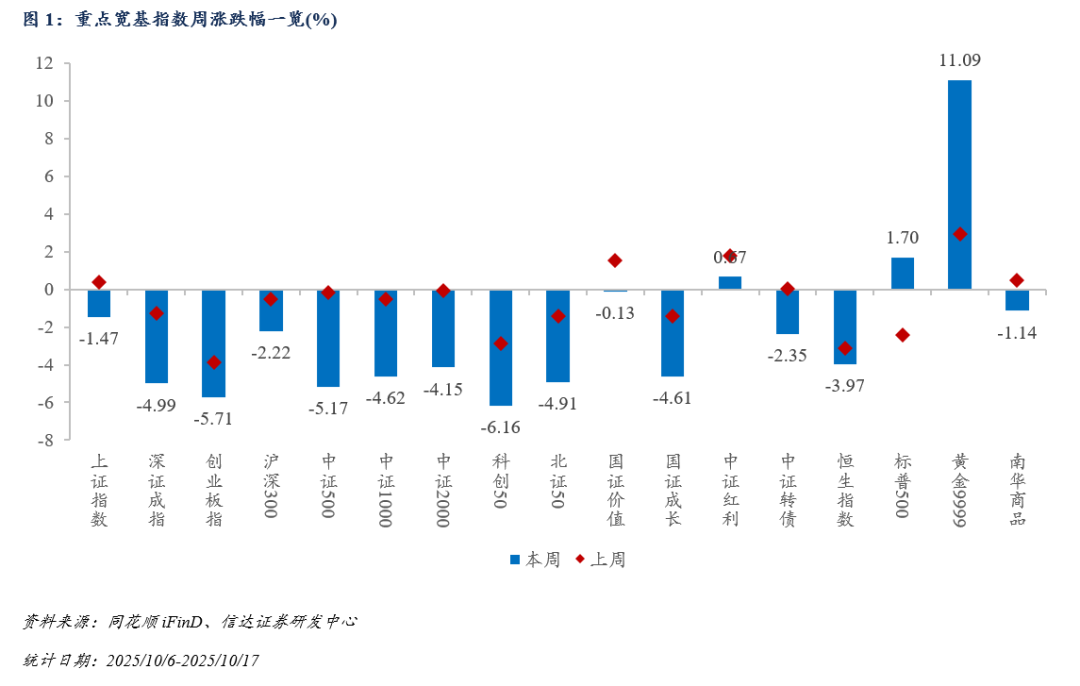 宽基指数表现回顾:本周(2025/10/13-2025/10/17)A股各宽基指数普遍下跌,黄金表现强势。截至2025/10/17,上证指数报收3839.76点,周涨跌幅约-1.47%;深证成指报收12688.94点,周涨跌幅约-4.99%;创业板指报收2935.37点,周涨跌幅约-5.71%;沪深300报收4514.23点,周涨跌幅约-2.22%。