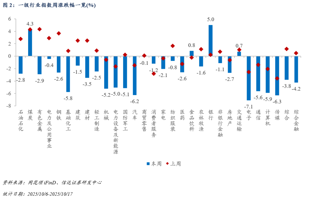 行业指数表现回顾:本周(2025/10/13-2025/10/17)有色金属、电力设备及新能源、电子等行业表现较优。周涨跌幅排名居前的行业有银行、煤炭、食品饮料、交通运输、商贸零售等,收益率依次为4.99%、4.27%、0.85%、0.73%、-0.08%;周涨跌幅排名靠后的行业包括电子、传媒、汽车、计算机、基础化工等,收益率依次为-7.10%、-6.28%、-6.24%、-5.90%、-5.76%。