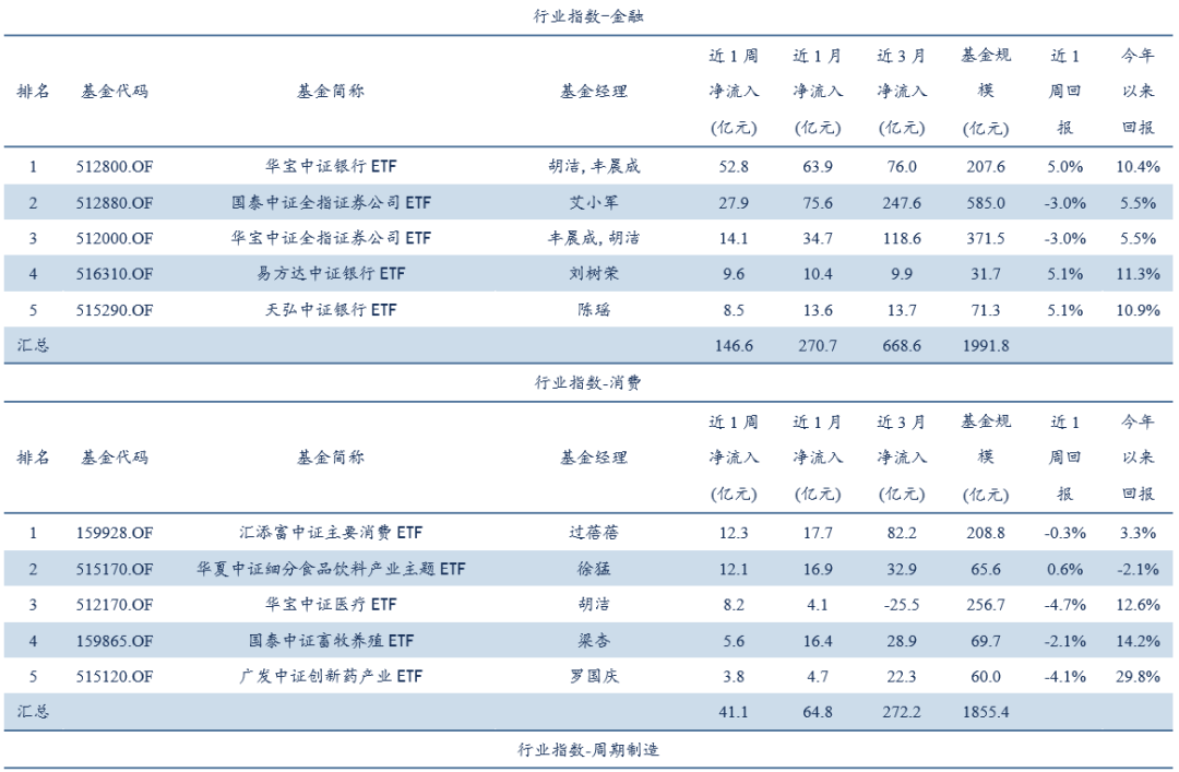 行业ETF方面,本周资金净流入约410.12亿元,合计规模为9709.29亿元。其中,TMT净流入58.25亿元,金融净流入146.64亿元,消费净流入41.12亿元,周期制造净流入164.1亿元。