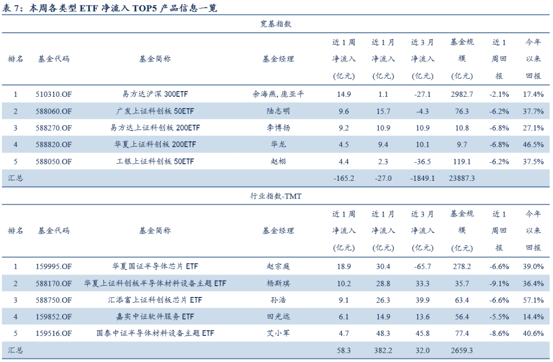 宽基ETF方面,本周资金净流出约165.23亿元,合计规模为23887.26亿元。其中,净流入较多的产品为易方达沪深300ETF、广发上证科创板50ETF、易方达上证科创板200ETF、华夏上证科创板200ETF、工银上证科创板50ETF,净流入金额分别为14.86亿元、9.59亿元、9.17亿元、4.53亿元、4.37亿元。