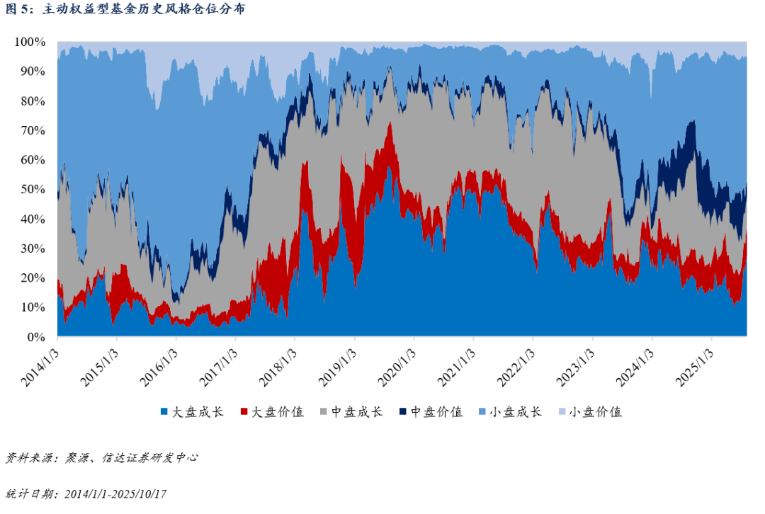 近一周公募基金风格仓位变化不显著。截至2025/10/17,主动偏股型基金大盘成长仓位36.4%(较上周下降0.95pct),大盘价值仓位9.55%(较上周下降0.02pct),中盘成长仓位7.92%(较上周下降0.04pct),中盘价值仓位4.38%(较上周下降0.35pct),小盘成长仓位32.89%(较上周上升1pct),小盘价值仓位8.86%(较上周上升0.38pct)。