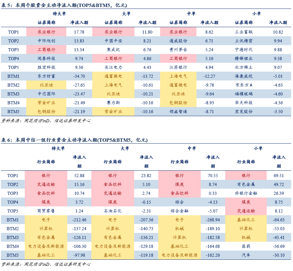 主力/主动资金流向:主力资金流:本周主力净流出电子、电新,流入银行、煤炭。(1)个股:主力净流入&中小单净流出:农业银行、工商银行、长安汽车、长江电力、东信和平等。主力净流出&中小单净流入:宁德时代、中芯国际、北方稀土、东方财富、比亚迪等。(2)行业:主力净流入&中小单净流出:银行、煤炭等。主力净流出&中小单净流入:电子、电力设备及新能源、有色金属、计算机、机械等。主动资金流:本周主买净额约-4301.17亿元,主动资金净流出电子、计算机。(1)个股:主动资金更看好农业银行、工商银行、中国平安、闻泰科技、通威股份等标的,比亚迪、东方财富、包钢股份、赛力斯、上海电气等标的遭主动资金净卖出。(2)行业:主买净额居前的行业有:银行、煤炭、交通运输、食品饮料等;流出较多的行业有:电子、计算机、基础化工、机械、电力设备及新能源等。