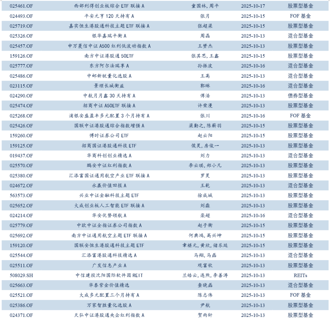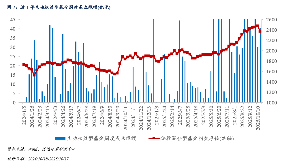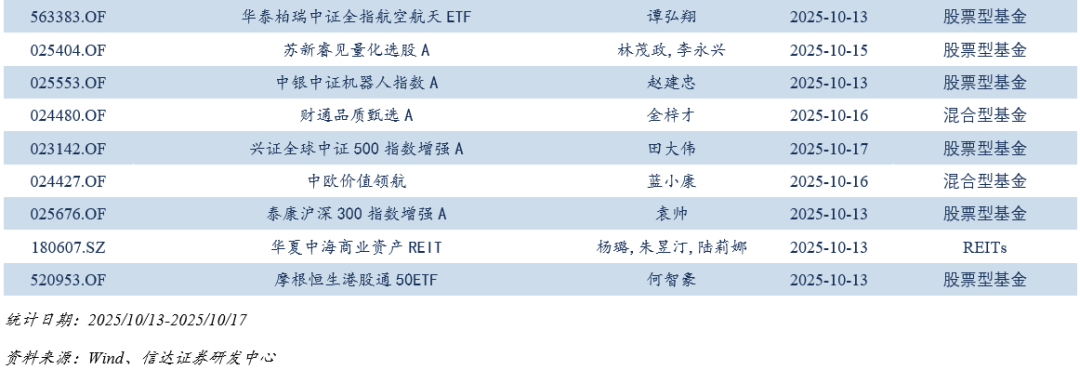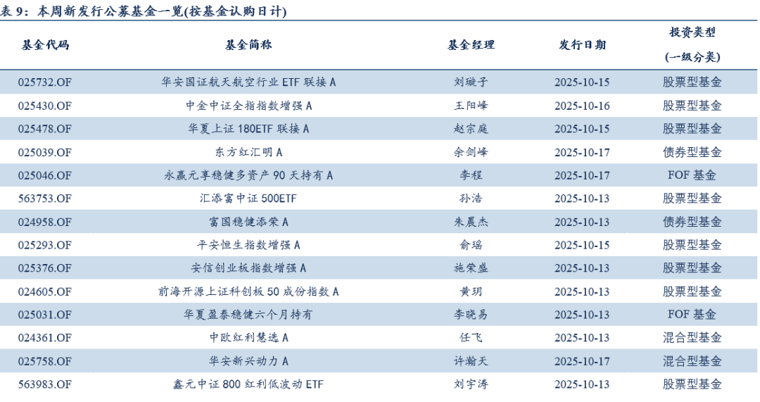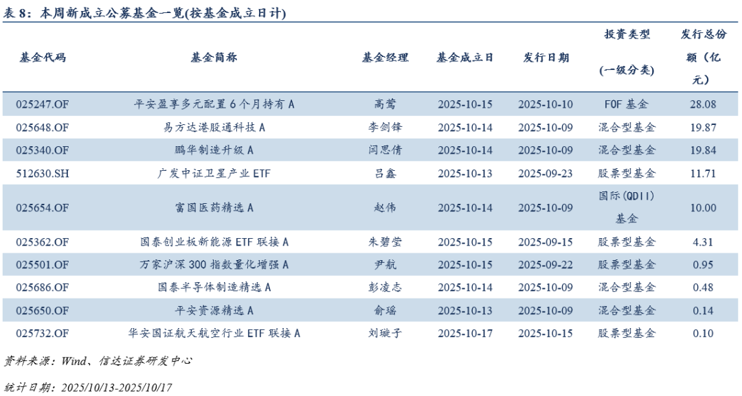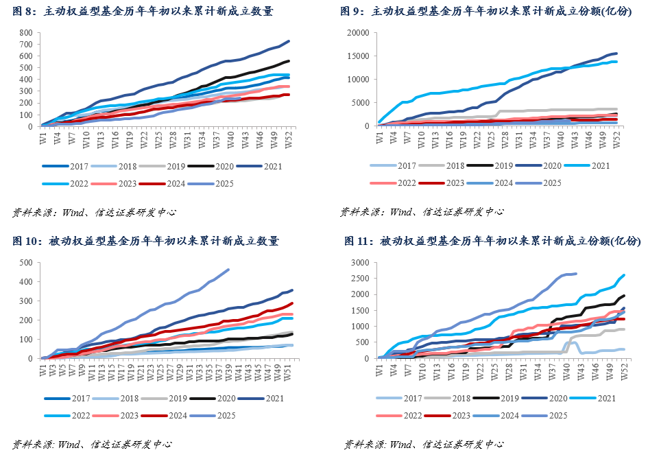 本周境内新成立基金数目共计10只,主动权益型基金新发总份额约为40.33亿份,为近 1 年82.60%分位。今年以来,主动权益型基金新发21只,规模合计约1132.80亿元,约为2024年同期水平的197.91%;被动权益型基金新发476只,规模合计2646..12亿元,约为2024年同期水平的318.46%。