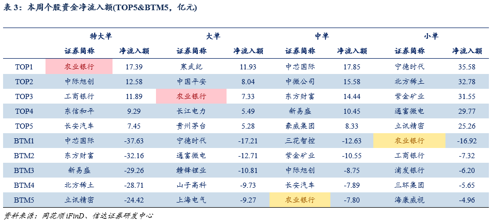 主力资金流:本周主力净流出电子、电新,流入银行、煤炭。(1)个股:主力净流入&中小单净流出:农业银行、工商银行、长安汽车、长江电力、东信和平等。主力净流出&中小单净流入:宁德时代、中芯国际、北方稀土、东方财富、比亚迪等。(2)行业:主力净流入&中小单净流出:银行、煤炭等。主力净流出&中小单净流入:电子、电力设备及新能源、有色金属、计算机、机械等。