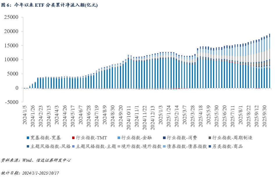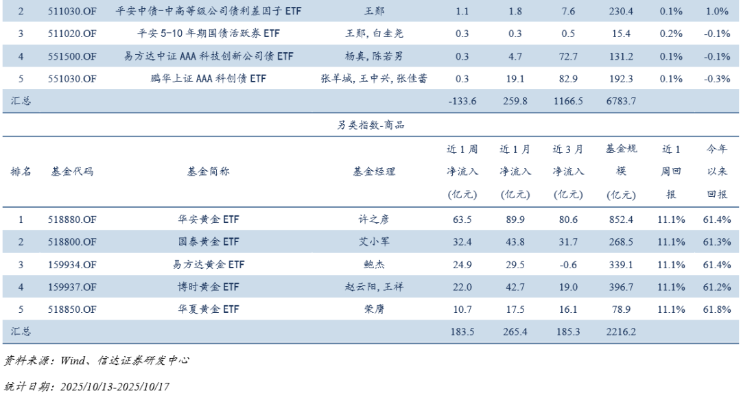 本周(2025/10/13-2025/10/17),境内股票ETF资金合计净流入约265.5亿元,合计规模为36134.08亿元;跨境ETF合计净流入约228.1亿元,合计规模为8523.93亿元;债券ETF合计净流出约133.57亿元,合计规模为6783.74亿元;商品ETF合计净流入约183.54亿元,合计规模为2216.23亿元。