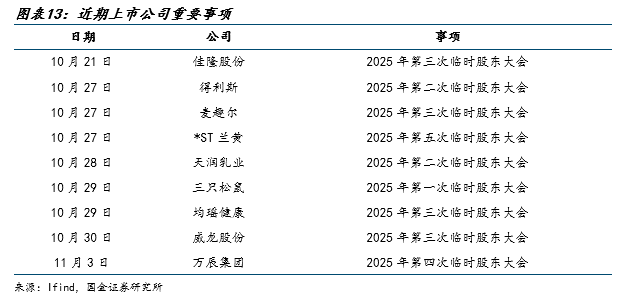 休闲零食:受益于下游渠道扩张、推新节奏加快,板块延续高景气。下游新渠道如零食量贩门店9月仍保持较快的开店速度,且单店同比降幅收窄。产品端,各大厂商重视魔芋、鹌鹑蛋等健康品类发展红利,针对形态和口味进行差异化研发,网点覆盖率以及单点产出持续增长。本周盐津在山姆渠道上新溏心鹌鹑蛋,验证其在产品端的研发实力和响应速度,未来仍有望打磨更多大单品,优化产品结构提升利润率。我们持续看好零食量贩开店空间及魔芋品类红利,推荐万辰集团、盐津铺子、卫龙美味。建议关注洽洽食品新成本采购情况,Q4有望实现业绩改善。