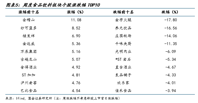 从个股表现来看,周度涨跌幅居前的为:会稽山(+11.08%)、妙可蓝多(+8.52%)、桂发祥(+6.90%)、金达威(+5.36%)、万辰集团(+5.16%)等。涨跌幅靠后的为:金字火腿(-17.80%)、养元饮品(-16.56%)、庄园牧场(-14.06%)、千味央厨(-11.35%)、光明肉业(-6.09%)等。