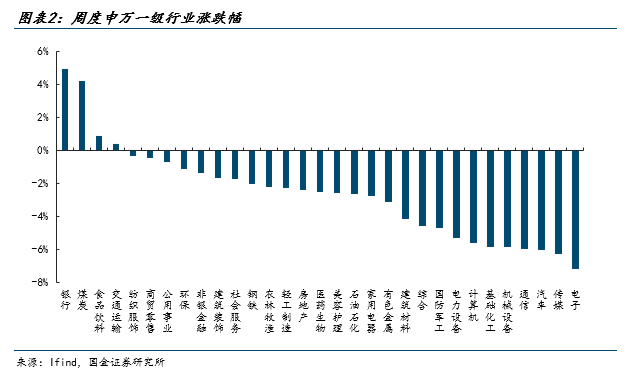 从一级行业涨跌幅来看,周度涨跌幅前三为银行(+4.89%)、煤炭(+4.17%)、食品饮料(+0.86%)。