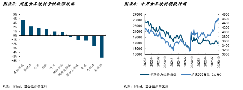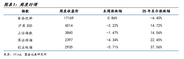本周(10.13~10.17)食品饮料(申万)指数收于17169点(+0.86%),沪深300指数收于4514点(-2.22%),上证综指收于3840点(-1.47%),深证综指收于2397点(-4.34%),创业板指收于2935点(-5.71%)。