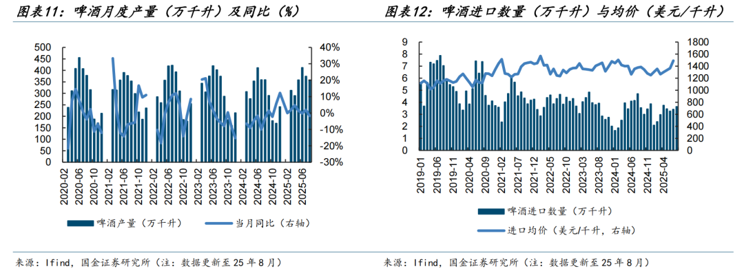软饮料:旺季渐近尾声,行业延续结构增长态势,景气度拐点向上。高景气细分赛道(能量饮料、无糖茶、椰子水等)龙头保持稳健增长,且通过布局第二曲线高基数下增速仍具备亮点。但传统品类(含糖茶、果汁、奶茶等)受闪购补贴分流、健康饮品替代等原因需求有所承压。当前我们仍看好高景气细分赛道龙头,叠加自身渠道管理优势、品类扩张潜力有望维持业绩高增长,推荐东鹏饮料、农夫山泉,建议关注预调酒基本盘企稳的百润股份。