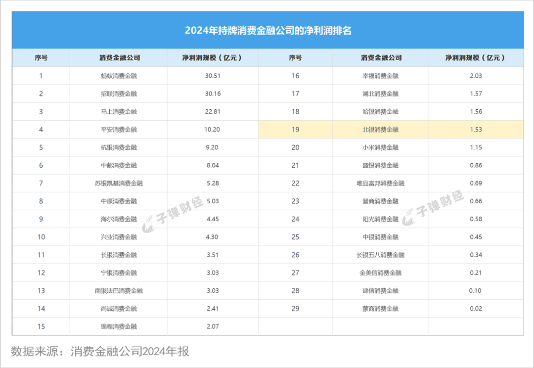 在净利润方面,北银消费金融2024年末达到1.53亿元,排在第19名。相较行业第一的蚂蚁消费金融(净利润30.51亿元),两者差距近20倍。