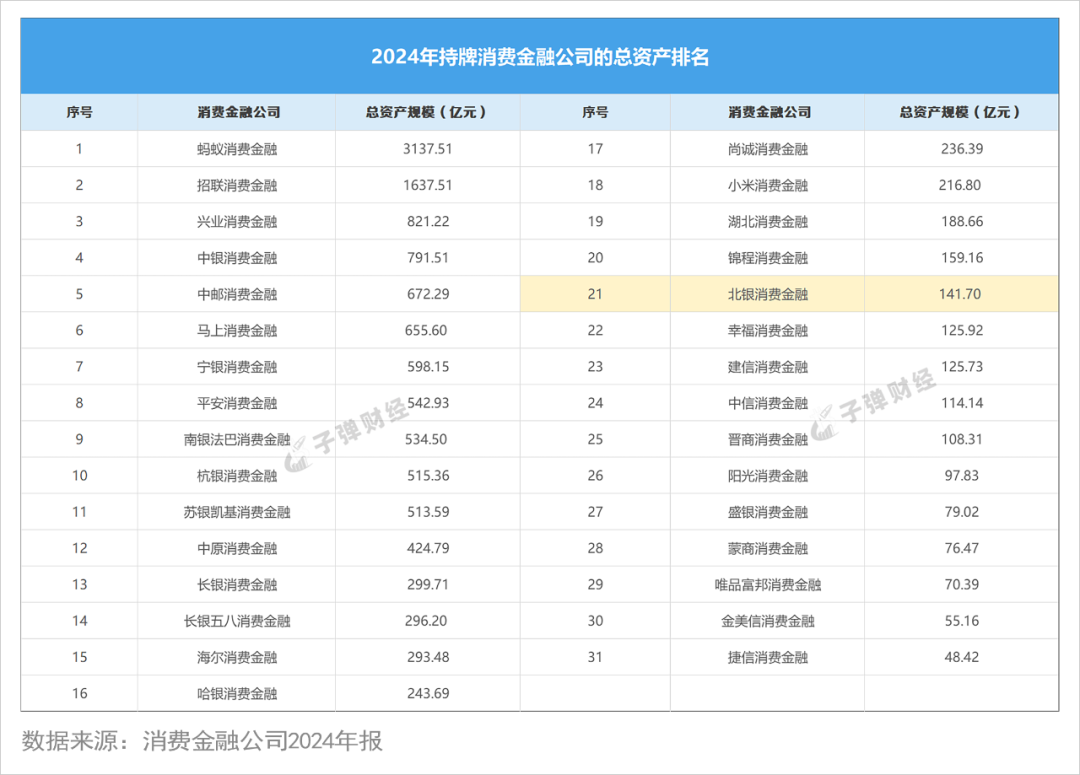 在总资产方面,北银消费金融2024年末达到141.7亿元,排在第21名。而占据行业第一的依旧是蚂蚁消费金融(总资产3137.51亿元),两者相差22倍。