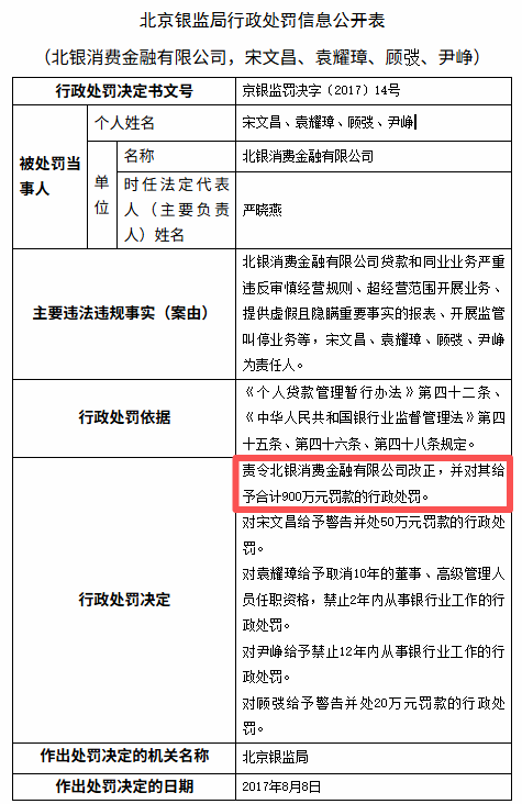 2017年8月,监管部门再次对北银消费金融开出了900万元罚单。处罚事由包括:严重违反审慎经营规则、超经营范围开展业务、提供虚假且隐瞒重要事实的报表、开展监管叫停业务等,宋文昌、袁耀璋、顾弢、尹峥为责任人。
