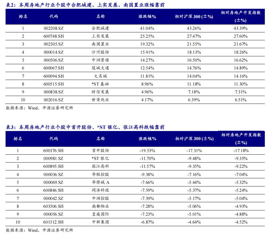 5、一周行情回顾板块表现方面,本周(2025年10月13-17日,下同)房地产指数下跌2.35%,沪深300指数下跌2.22%,相对收益为-0.12%,板块表现弱于大市,在28个板块排名中排第14位。个股表现方面,房地产板块涨跌幅排名前5位的房地产个股分别为:合肥城建、上实发展、南国置业、沙河股份、中润资源,涨跌幅排名后5位的房地产个股分别为首开股份(维权)、*ST银亿、张江高科、华联控股、华侨城A。