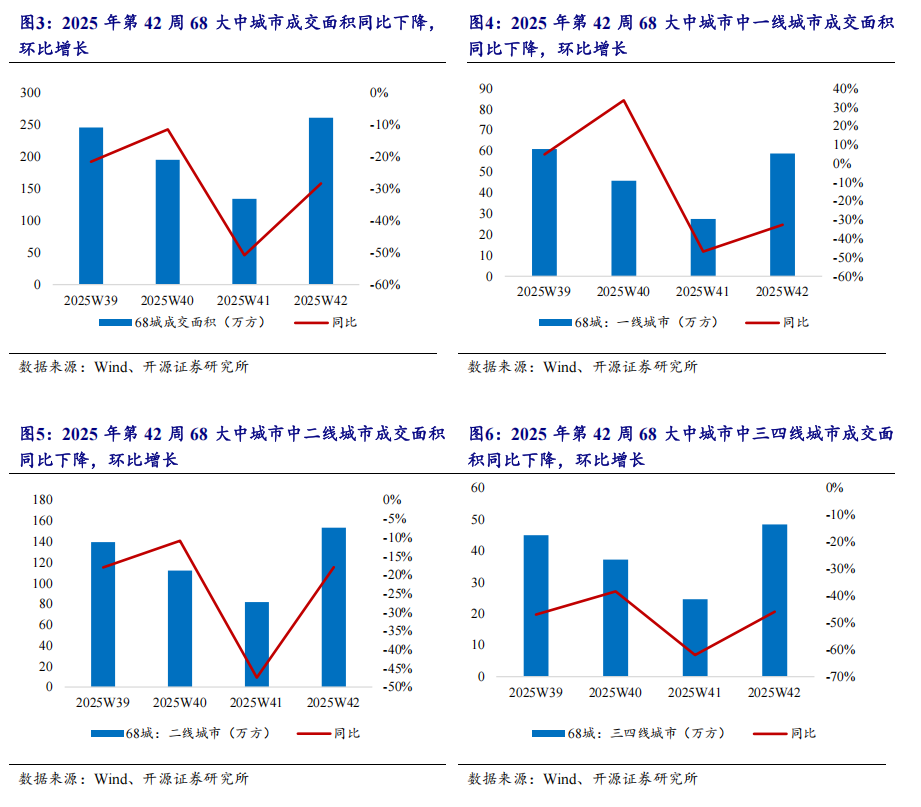 根据房管局数据,2025年第42周,全国68城商品住宅成交面积年初至今累计增速-12%。各线城市走势基本一致,一、二、三四线单周成交同比增速分别为-33%、-18%、-46%,年初至今累计增速0%、-9%、-98%。