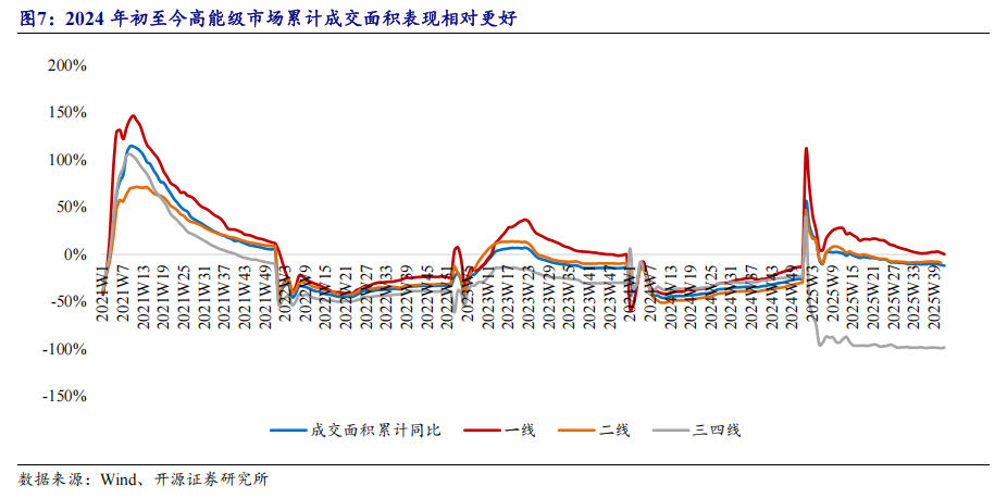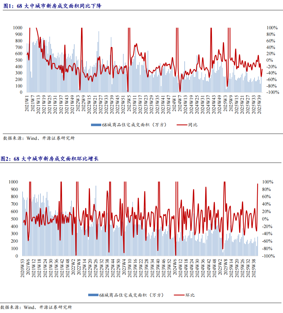 销售端:根据房管局数据,2025年第42周,全国68城商品住宅成交面积261万平米,同比下降28%,环比增加95%;从累计数值看,年初至今68城成交面积达9437万平米,累计同比下降12%。全国20城二手房成交面积为192万平米,同比增速-17%,前值-45%;年初至今累计成交面积7861万平米,同比增速7%,前值+7%。