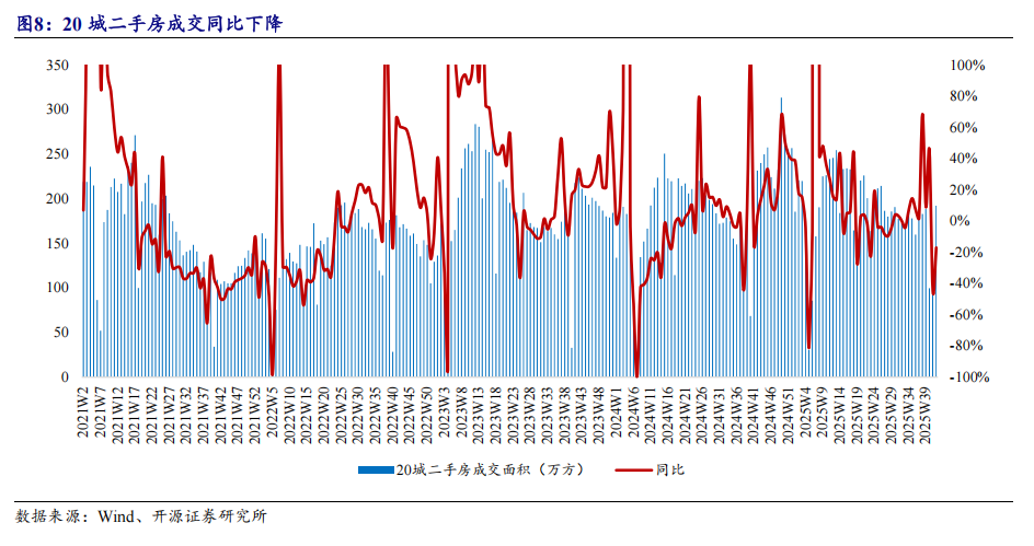 2025年第42周,全国20城二手房成交面积为192万平米,同比增速-17%,前值-45%;年初至今累计成交面积7861万平米,同比增速7%,前值+7%。