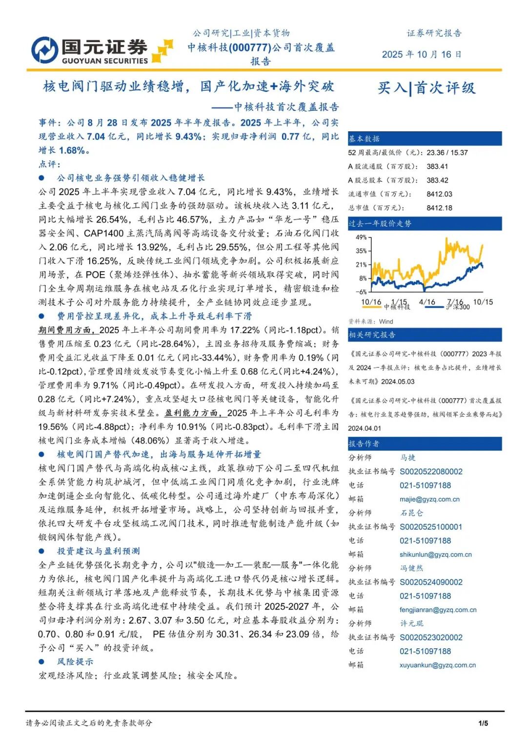 本报告摘自国元证券2025年10月16日已发布的《核电阀门驱动业绩稳增,国产化加速+海外突破——中核科技首次覆盖报告》,具体报告及分析内容请详见报告。若因对报告的摘编等产生歧义,应以报告发布当日的完整内容为准。