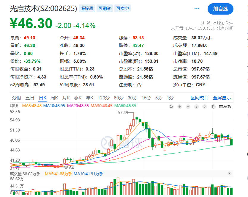 业绩方面,2025年上半年,光启技术营业收入为9.43亿元,同比上升10.7%;归母净利润为3.86亿元,同比上升6.7%;扣非归母净利润为3.76亿元,同比上升5.4%;经营现金流净额为1.61亿元,同比下降49.6%;EPS(全面摊薄)为0.179元。截至10月17日收盘,光启技术市值约997亿元。