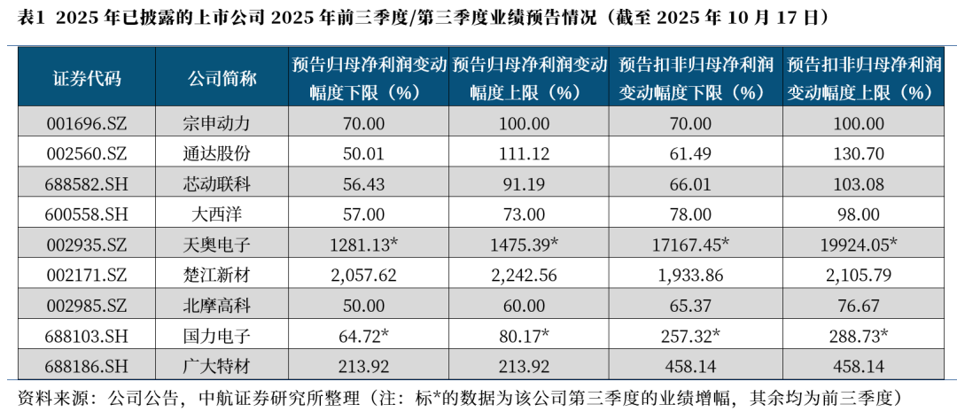 截至10月17日,除已披露三季度正式报告的图南股份、民士达之外,已有近10家上市公司相继发布2025年前三季度/第三季度业绩预告。具体的变动幅度情况如下: